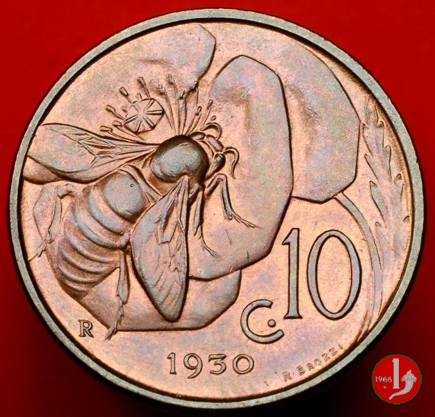 prova 10 centesimi ape Obverse: Testa nuda, volta a sinistra. Intorno, circolarmente "VITTORIO EMANVELE III RE D'ITALIA". Reverse: Ape su fiore. A sinistra, in basso, la sigla di zecca ( R ), a destra l'indicazione del valore (C.10) e in basso la data. Lungo il bordo, in basso a sinistra la dicitura "PROVA", e a destra il nome dell'autore del R/ (R. BROZZI). | |