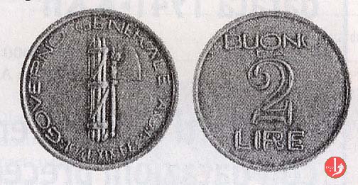 Buono da 2 lire Obverse: Semibusto del Re volto a destra in uniforme. Intorno VITTORIO • EMANUELE • III • RE • D'ITALIA. Reverse: Fascio littorio con scure a destra. a sinistra su tre righe BUONO DA LIRE 2; a destra la data. In basso sul lato destro del manico della scure il segno di zecca (R). A ore 1 sul bordo i nomi dell'incisore (A • MOTTI INC.) e dell'autore (P • MORBIDUCCI). | |