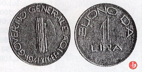 buono da 1 lira Obverse: Indicazione del valore: circolarmente lungo il bordo superiore BUONO DA, al centro del campo 1 e sotto, orizzontalmente, LIRA. Reverse: Fascio littorio, intorno GOVERNO GENERALE A • O • I •. In basso indicazione della data • 1941 - XIX-EF •. | |