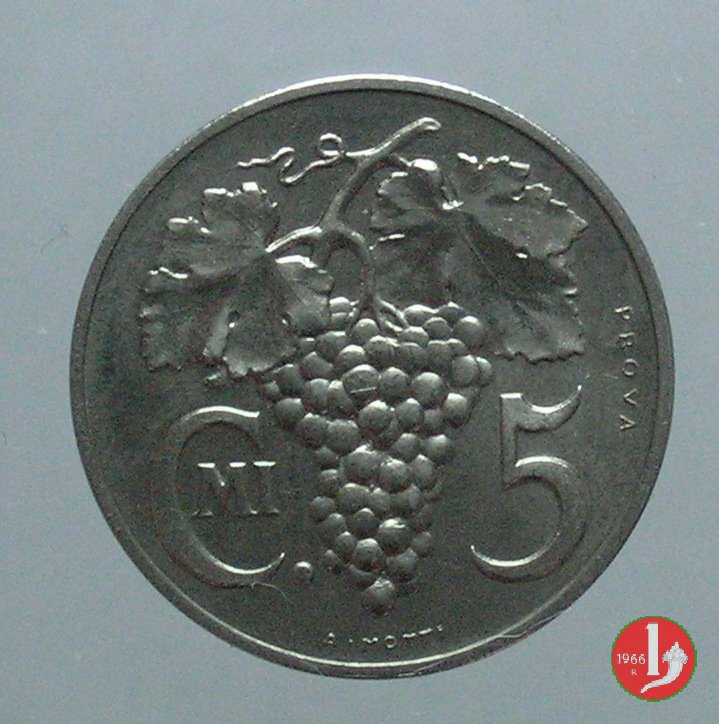 prova del progetto 5 centesimi 1918 Obverse: Testa nuda volta a sinistra. Intorno, circolarmente "VITTORIO EMANVELE III RE D'ITALIA". Sotto il collo, l'indicazione dell'autore (A. MOTTI). Reverse: Spiga di grano, con foglia a sinistra, ai lati della quale è l'indicazione del valore (C. / 5). A destra la data (1918) e piú in basso la sigla di zecca (R). A sinistra, nel campo, orizzontalmente, la dicitura "PROVA". | |