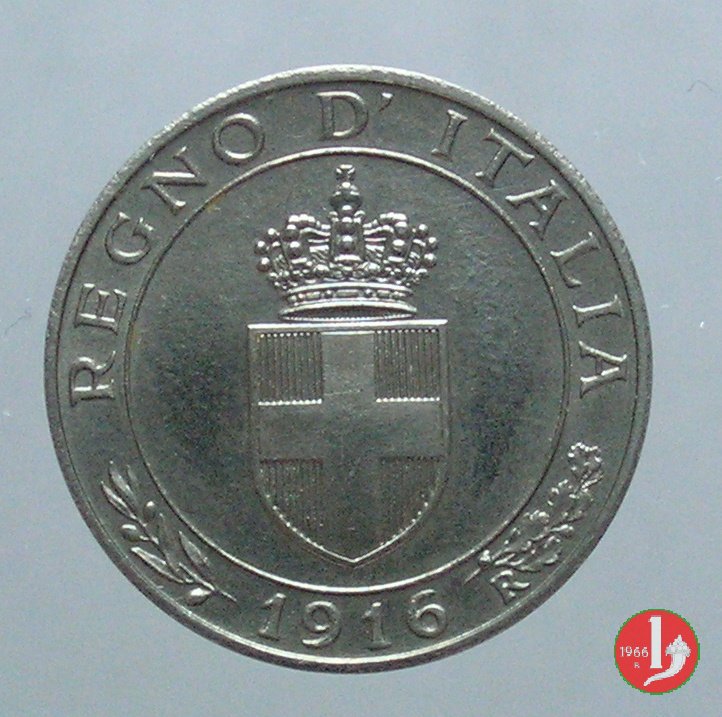 progetto 10 centesimi 1915 Obverse: Stemma sabaudo coronato e circondato dal collare dell'Annunziata e da rami di lauro. Intorno, circolarmente, "REGNO D'ITALIA". In basso, lungo il bordo, a sinistra la data (1915) sormontata da un fiore di loto e a destra il segno di zecca tra due stellette ( ![]() R![]() ).Reverse: Nel campo spiga di grano, ai lati della quale è l'indicazione del valore (C./10). | |