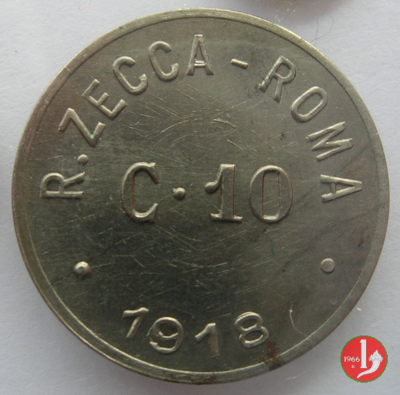 prova di lega 10 centesimi 1918 Obverse: In alto, circolarmente, "R. ZECCA - ROMA". Nel campo, su due righe, l'indicazione del valore e la data (C. 10/ 1918), con tre globetti lungo il bordo, in basso. Reverse: In alto, circolarmente, "PROVA DI LEGA". Nel campo, "FERRO NICHEL". In basso stella a cinque punte. | |