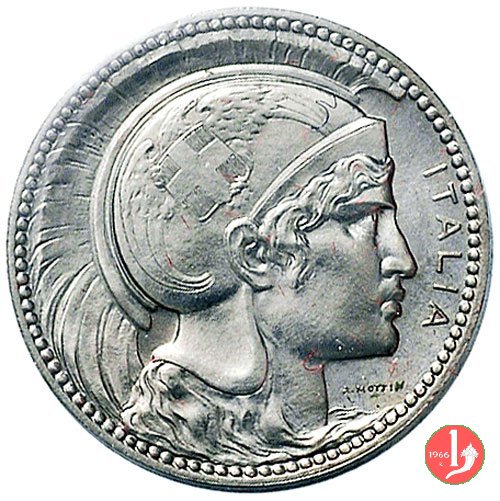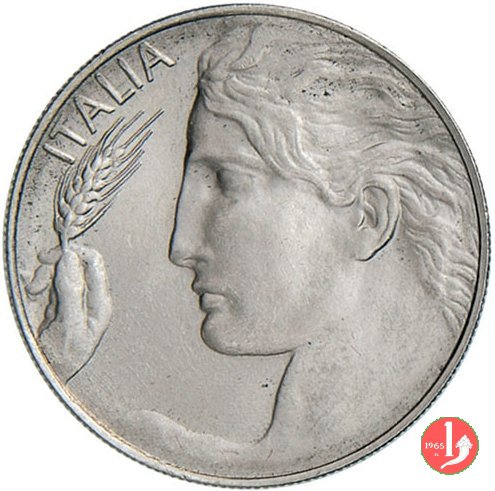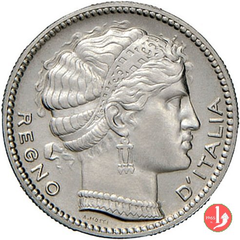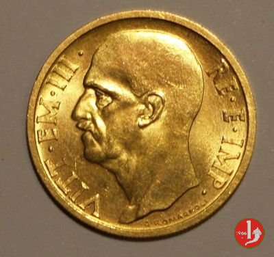 20 lire littore Obverse: Testa del Re volta a destra contornata dalla scritta • VITTORIO • EMANUELE • III • RE Reverse: Figura maschile nuda recante un fascio, che saluta romanamente una figura femminile (allegoria dell'Italia) seduta che reca una fiaccola con la mano destra e appoggia la sinistra ad uno scudo con lo stemma Sabaudo. In esergo l'indicazione del valore (L. 20) e a destra su due righe il nome dell'autore (G. ROMAGNOLI) e dell'incisore (A. MOTTI INC.). A destra della figura femminile su due righe l'anno e il segno di zecca (R); in corrispondenza a sinistra l'anno dell'Era Fascista. In alto la scritta ITALIA. | |