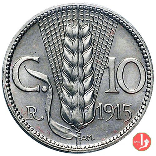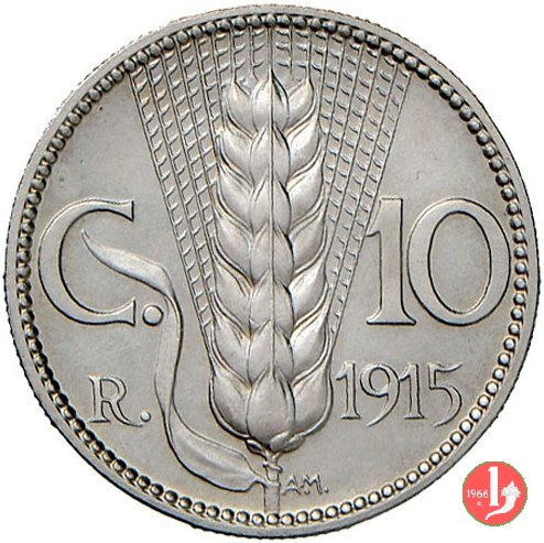 progetto 10 centesimi 1915 Obverse: Testa nuda a destra; intorno, circolarmente, "VITTORIO EMANVELE III RE D'ITALIA". Sotto il collo il nome dell'autore (A. MOTTI). Reverse: Spiga di grano. Ai lati il valore (C. 10), la data (1915) a destra e il marchio di zecca a sinistra (R). In basso, a destra, la sigla del nome dell'autore (A.M.). | |