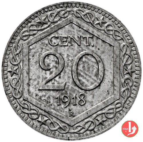 prova 20 centesimi esagono Obverse: Scudo sabaudo coronato, tra rami di lauro e di quercia intrecciati. In alto, circolarmente, lungo il bordo "REGNO D'ITALIA". Reverse: Esagono in corona di lauro. Nel campo, su due righe, l'indicazione del valore, e la data (C.MI 20 / 1918). Lungo il lato inferiore sinistro dell'esagono la dicitura "PROVA". |