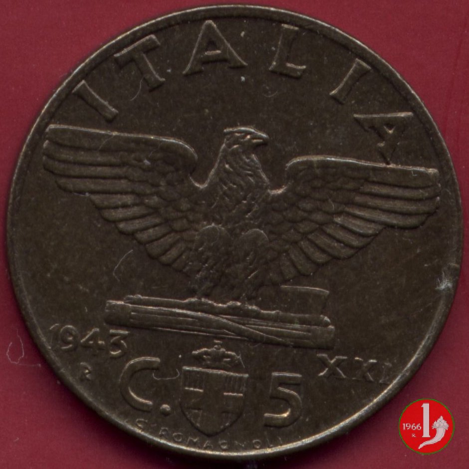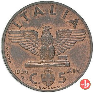 prova 5 centesimi impero Obverse: Testa nuda, volta a destra. Intorno, circolarmente "VITT • EM • III • RE • E • IMP •" Reverse: Aquila ad ali spiegate, su fascio littorio. In alto, circolarmente "ITALIA". Sotto il fascio, stemma sabaudo coronato, tra lindicazione del valore (C./5), la data e il segno di zecca a sinistra, e l'era fascista a destra. In basso, circolarmente, il nome dell'autore (G. ROMAGNOLI). Circolarmente, nel campo, a sinistra la dicitura "PROVA". | |