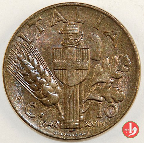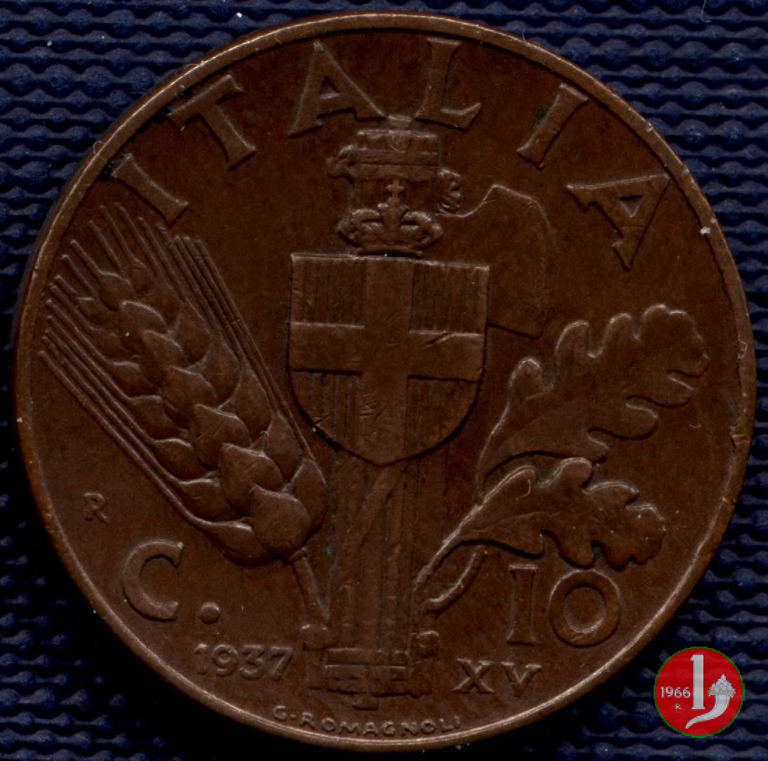 10 centesimi impero bronzital Obverse: Stemma sabaudo con corona reale sovrapposto ad un fascio. A destra una foglia di quercia, a sinistra una spiga di grano. Ai lati della base del fascio millesimo e anno dell'Era Fascista; sopra l'indicazione del valore (C. 10). In alto lungo il bordo la scritta ITALIA, a ore 4 l'indicazione dell'autore (G. ROMAGNOLI) e a ore 8 il segno di zecca (R). Reverse: Volto del Re a sinistra, intorno la scritta VITT. EM. III. RE. E. IMP. | |