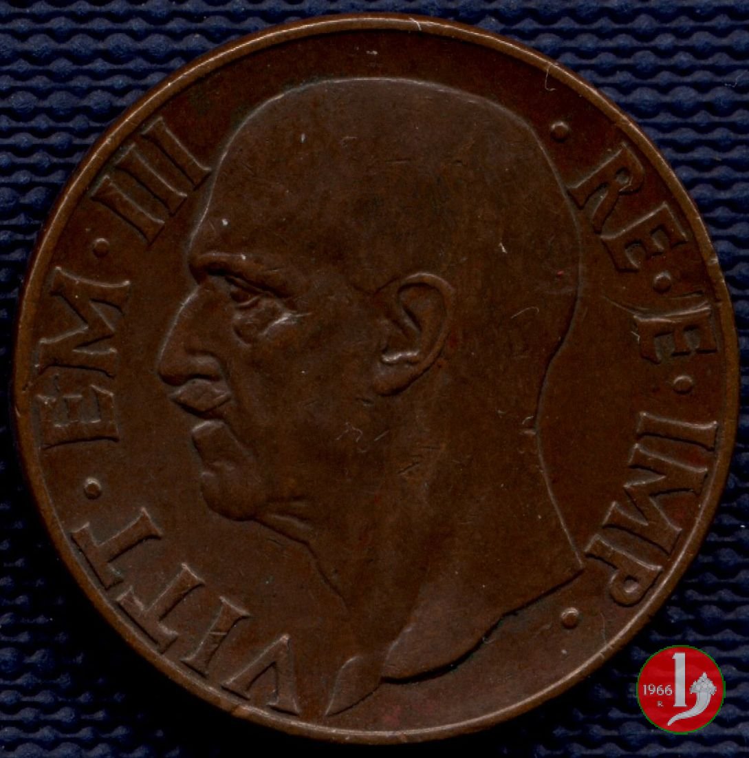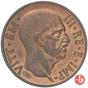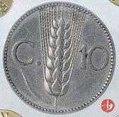 10 centesimi impero rame Obverse: Stemma sabaudo con corona reale sovrapposto ad un fascio. A destra una foglia di quercia a sinistra una spiga di grano. Ai lati della base del fascio millesimo e anno dell'Era Fascista; sopra l'indicazione del valore (C. 10). In alto lungo il bordo la scritta ITALIA, a ore 4 l'indicazione dell'autore (G. ROMAGNOLI) e a ore 8 il segno di zecca (R). Reverse: Volto del Re a sinistra, intorno la scritta VITT. EM. III. RE. E. IMP. | |