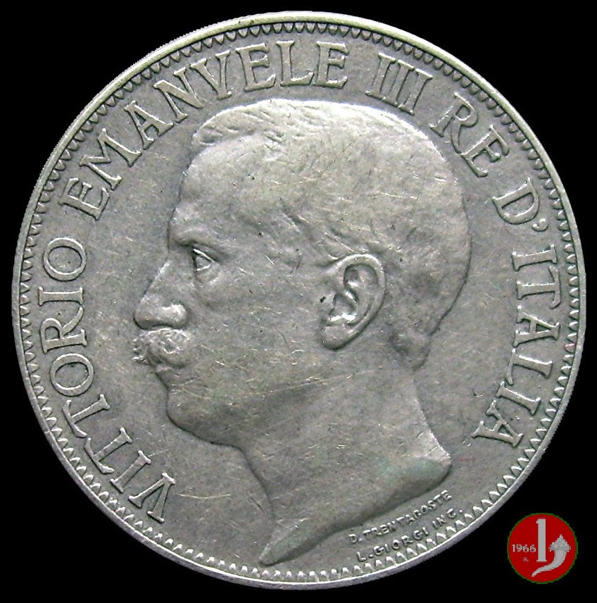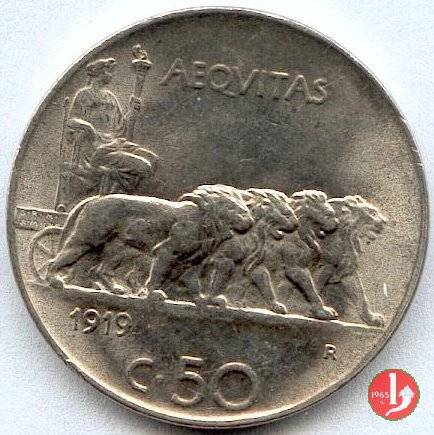 50 centesimi leoni Obverse: Figura allegorica dell'Italia che regge una fiaccola su un carro trainato da 4 leoni, in alto orizzontalmente AEQVITAS. Sul carro le iniziali dell'autore (G.R.M.). In esergo indicazione del valore (C. 50). Sotto la base dei leoni a sinistra indicazione del millesimo, a destra segno di zecca (R). Reverse: Semibusto del Re in uniforme volto a sinistra. Intorno lungo il bordo a sinistra VITT • EM . III • RE a destra • D'ITALIA; sotto il busto il nome dell'autore (G. ROMAGNOLI). | |