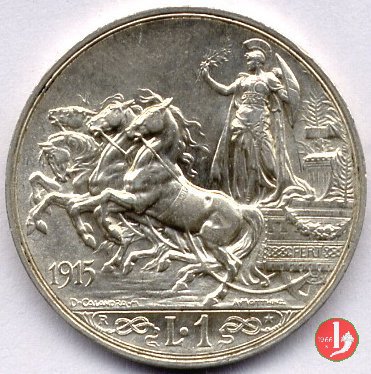 1 lira quadriga briosa Obverse: Figura allegorica dell'Italia con scudo, elmo e ramo di quercia posta su di un carro trainato da 4 cavalli che si impennano. Il carro è adornato di nodi savoia. In esergo il valore (L • 1) tra due nodi savoia, a sinistra del nodo di sinistra il segno di zecca (R), a destra del nodo di destra una stelletta a cinque punte. Sopra la riga dell'esergo il nome dell'incisore (A • MOTTI INC •) e dell'autore (D • CALANDRA). Reverse: Semibusto in uniforme del Re volto a destra, contornato da: VITTORIO EMANUELE III RE D'ITALIA, sotto il busto il nome dell'autore D • Calandra. | |