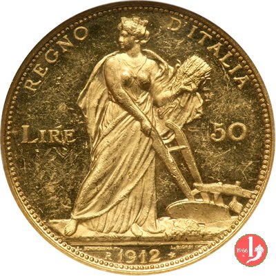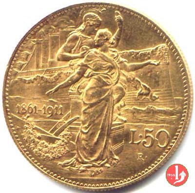 50 lire 50° Unità d'Italia Obverse: Testa del Re volta a sinistra, attorno: VITTORIO EMANUELE III RE D'ITALIA. Sotto il collo del Re i nomi dell'autore (D • TRENTACOSTE) e dell'incisore (L • GIORGI INC •) su due righe. Reverse: Due figure allegoriche che simboleggiano l'Italia (la figura femminile) e la città di Roma (la figura maschile posta su di un piedistallo). Sullo sfondo la prora di una nave a vapore ornata dalla scudo sabaudo e da festoni. A sinistra un aratro ornato con una ghirlanda di fiori a cui sono sovrapposte le date 1861-1911. A destra l'indicazione del valore (L • 50) e sotto il segno di zecca (R •). | |