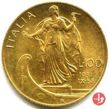 100 lire prora Obverse: Semibusto del Re con il Collare dell'Annunziata volto a sinistra contornato dalla scritta: VITTORIO • EMANUELE • III • RE. Sotto il busto un nodo savoia, sotto al quale lungo il bordo i nomi degli autori (G • ROMAGNOLI e A • MOTTI INC •). Reverse: Figura femminile allegoria dell'Italia ritta sulla prua di una nave mentre regge con la sinistra una fiaccola e con la destra un ramoscello di ulivo. Lungo il bordo tra ore 9 e ore 11 la scritta ITALIA. Sulla prua della nave vi è riportato in incuso un fascio con la scure rivolta a destra. A sinistra verso il basso, indicazione del valore (L • 100) e sotto millesimo e anno dell'Era Fascista con le lettere -E-F su due righe. | |