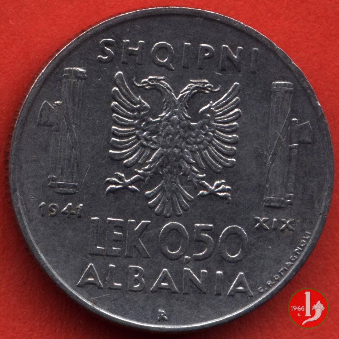 0,50 lek Obverse: Aquila bicipite albanese contornata da due fasci con le scuri verso l'esterno. Sotto il fascio di sinistra, il millesimo, sotto quello di destra, l'anno dell'Era Fascista. In alto SHQIPNI, sotto, indicazione del valore (LEK 0,50) e ALBANIA su due righe. A ore 6 il segno di zecca, da ore 4 a ore 5 lungo il bordo, indicazione dell'autore (G. ROMAGNOLI). Reverse: Semibusto in uniforme ed elmato del Re volto a sinistra. Intorno la scritta VITT • EM • III RE E IMP • MBRET E PER •. | |