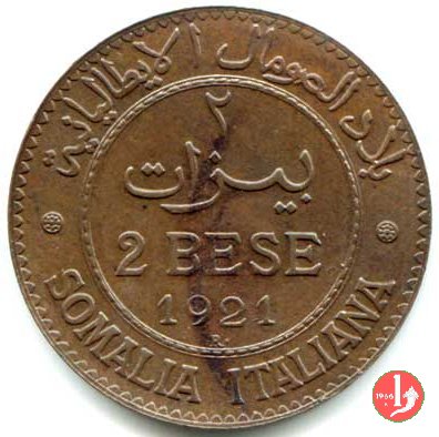 2 Bese Obverse: Nel campo indicazione del valore e del millesimo sia in italiano che in arabo all'interno di un cerchio. Intorno SOMALIA ITALIANA nella parte inferiore e in arabo nella parte superiore; le due scritte sono separate da due rosette. Sotto la data in caratteri latini, il segno di zecca (R •). Reverse: Semibusto del Re in uniforme visto di fronte ma volto a sinistra. Lungo il bordo la scritta VITTORIO • EMANVELE • III • RE • D'ITALIA • e ad ore 5 il nome dell'autore in incuso (L • GIORGI). | |