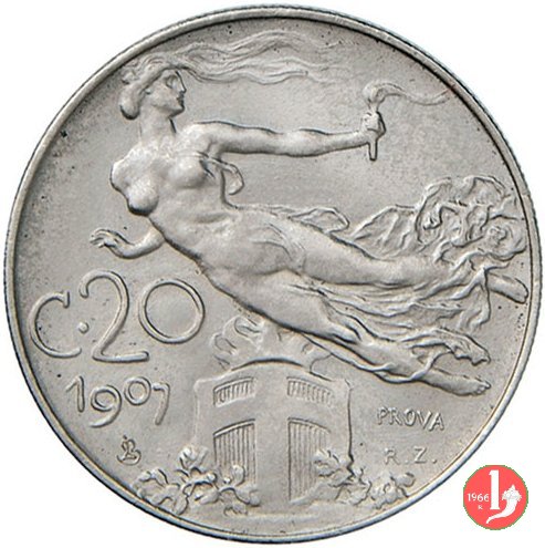 prova 20 centesimi libertà librata Obverse: Testa muliebre volta a sinistra, recante nella mano destra una spiga di grano. In alto a sinistra, circolarmente "ITALIA". Reverse: Allegoria della libertà, rappresentata dalla figura di una donna librantesi verso sinistra, recante, nella mano sinistra una fiaccola. A sinistra, su tre righe l'indicazione del valore, la data e il segno di zecca (C. 20/ 1907 / R). In basso stemma sabaudo coronato, circondato dal collare dell'Annunziata. A destra, orizzontalmente, su due righe "PROVA / R.Z". | |
