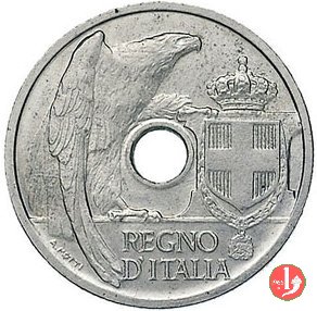 Scudo aquila sabauda Obverse: Testa del Re volto a destra contornato dalla scritta: VITTORIO EMANUELE III. Sotto il collo del Re, il nome dell'incisore SPERANZA. Reverse: Aquila araldica con stemma di casa Savoia. Lungo il bordo nella parte superiore REGNO D'ITALIA, nella parte inferiore separata dalla prima da due nodi savoia indicazione del valore (L • 5), il segno di zecca (R) tra due stelle a 5 punte e il millesimo. | |