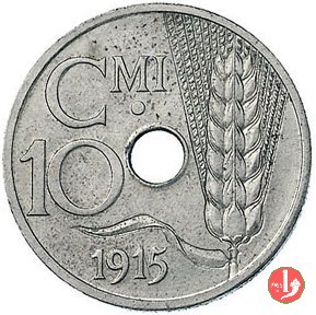 progetto 10 centesimi 1915 Obverse: Aquila volta a destra, poggiante la zampa sinistra su stemma sabaudo coronato e circondato dal collare dell' Annunziata. In basso, su due righe "REGNO D'ITALIA". Foro centrale di 3,5 mm. Reverse: A destra, nel campo, spiga di grano. A sinistra, su due righe, l' indicazione del valore (C.MI 10). In basso la data (1915). Foro centrale di 3,5 mm. | |
