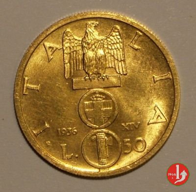 50 lire impero Obverse: Testa del Re a sinistra, intorno: VITTORIO • EMANUELE • III • RE • E • IMP •, in basso lungo il bordo: G. ROMAGNOLI. Reverse: Sommità di una insegna imperiale romana: in alto la tradizionale aquila ad ali leggermente spiegate, nel medaglione sottostante lo scudo Sabaudo e nel medaglione in basso un fascetto circondato dall'indicazione del valore (L. 50). Sopra il valore a sinistra il millesimo (1936), a destra l'anno dell'Era Fascista (XIV). A ore 8 lungo il bordo il segno di zecca (R). Intorno la scritta ITALIA. | |