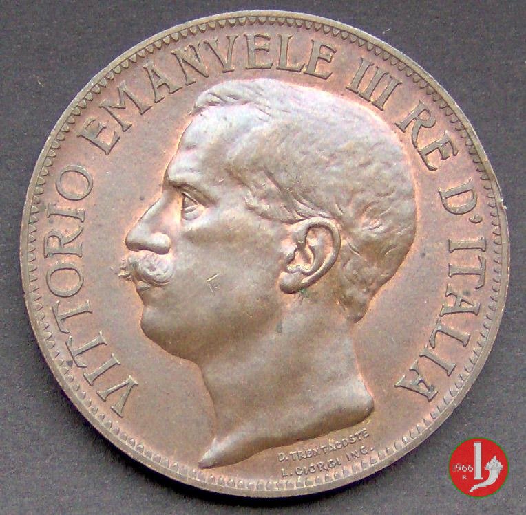 2 centesimi prora Obverse: Semi busto del Re in uniforme a sinistra, intorno: VITTORIO • EMANUELE • III • RE • D'ITALIA. Reverse: Figura allegorica femminile simboleggiante l'Italia su di una nave con un ramoscello di ulivo nella mano destra. Sulla prua della nave segno di zecca in incuso (R), sulla fiancata le iniziali degli autori P.C.M. per Pietro Canonica e L.G.I. per Luigi Giorgi in incuso. In alto lungo il bordo indicazione del valore (CENT • 2) e millesimo. | |