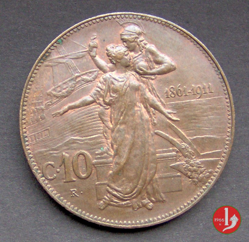 10 centesimi 50° Unità d'Italia Obverse: Due figure allegoriche che simboleggiano l'Italia (la figura femminile) e la città di Roma (la figura maschile posta su di un piedistallo al cui lato si intravede un aratro). Sullo sfondo la prora di una nave mercantile. A destra le date 1861-1911. A sinistra l'indicazione del valore (C • 10) e sotto il segno di zecca (R •). Reverse: Testa del Re volta a sinistra, attorno: VITTORIO EMANUELE III RE D'ITALIA. Sotto il collo del Re i nomi dell'autore (D • TRENTACOSTE) e dell'incisore (L • GIORGI INC •). | |