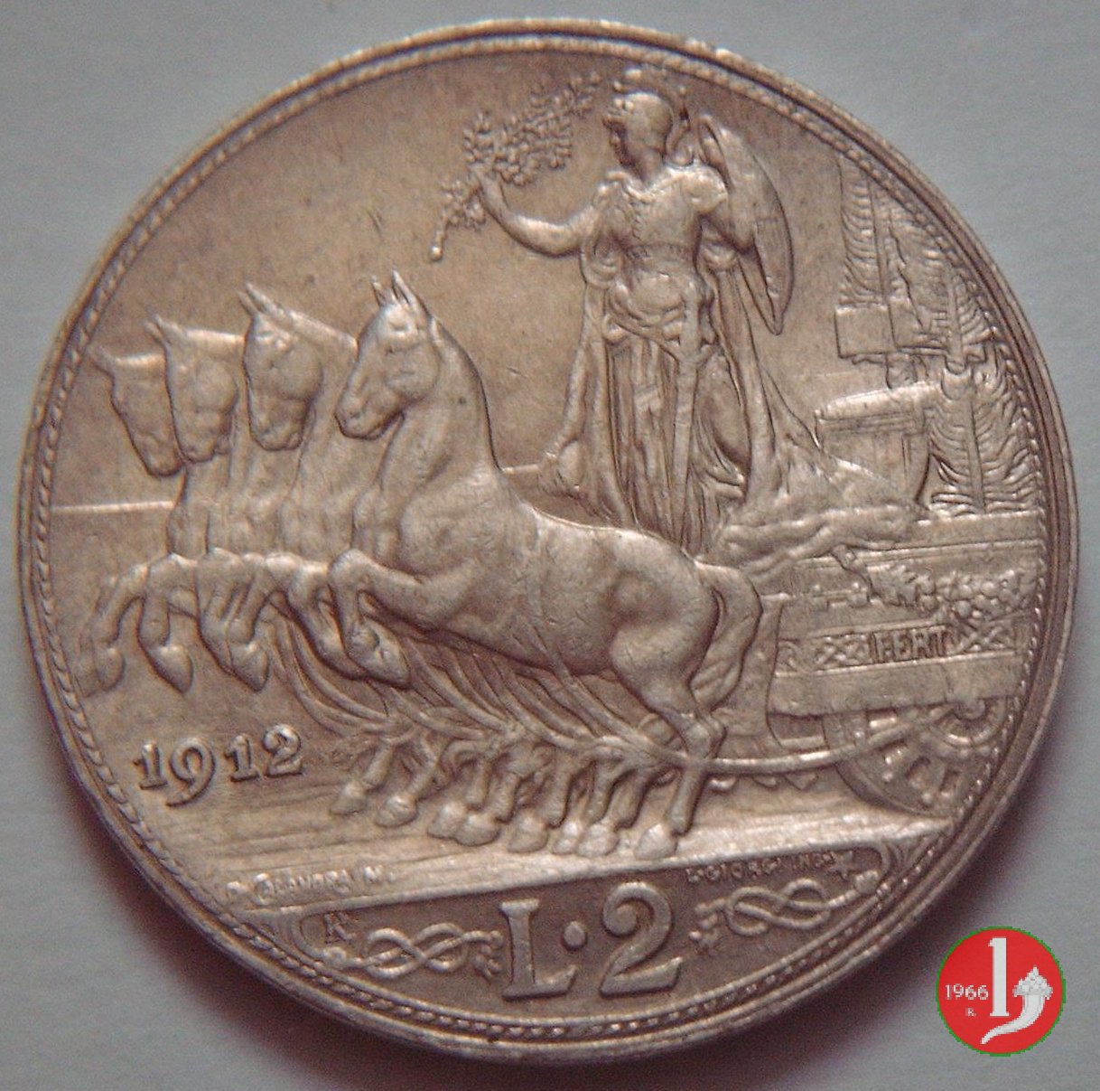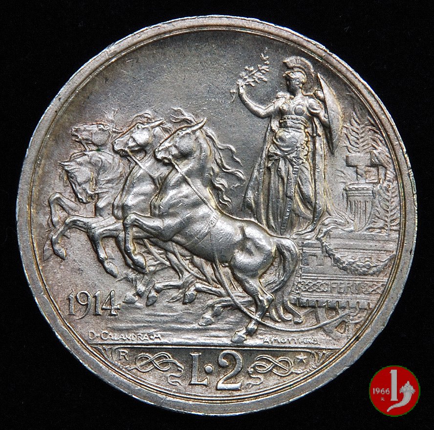 2 lire quadriga veloce Obverse: Semibusto in uniforme del Re volto a destra, contornato da: VITTORIO • EMANUELE • III • RE • D'ITALIA cerchiato. A ore 8 fra il colletto dell'uniforme e il cerchio interno il nome dell'autore D • CALANDRA M •. Reverse: Figura allegorica dell'Italia con scudo, elmo e ramo di quercia posta su di un carro trainato da 4 cavalli. Il carro è adornato di nodi savoia. In esergo il valore (L • 2) tra due nodi savoia, sopra il nodo di sinistra il segno di zecca (R), sopra il nodo di destra il nome dell'incisore: D • GIORGI INC. e una stella a 5 punte. A ore 7 sulla linea dell'esergo: D • CALANDRA M •. | |