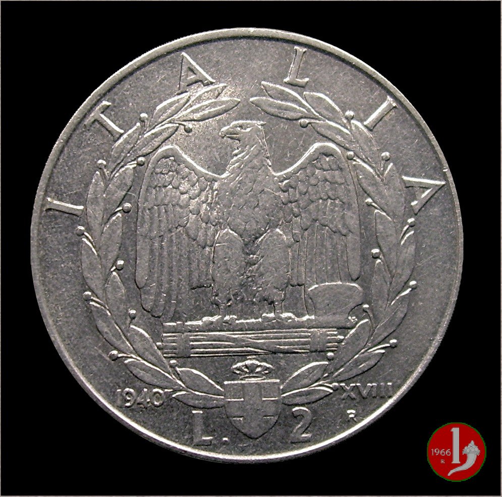 2 lire impero Obverse: Testa del Re a sinistra, intorno: VITTORIO • EMANUELE • III • RE • E • IMP •, in basso lungo il bordo: G • ROMAGNOLI. Reverse: Aquila con ali spiegate e fascio tra gli artigli, intorno, corona di alloro e la scritta: ITALIA. In basso stemma sabaudo tra il valore (L • 2) con a destra la data fascista e il segno di zecca e a sinistra il millesimo. | |