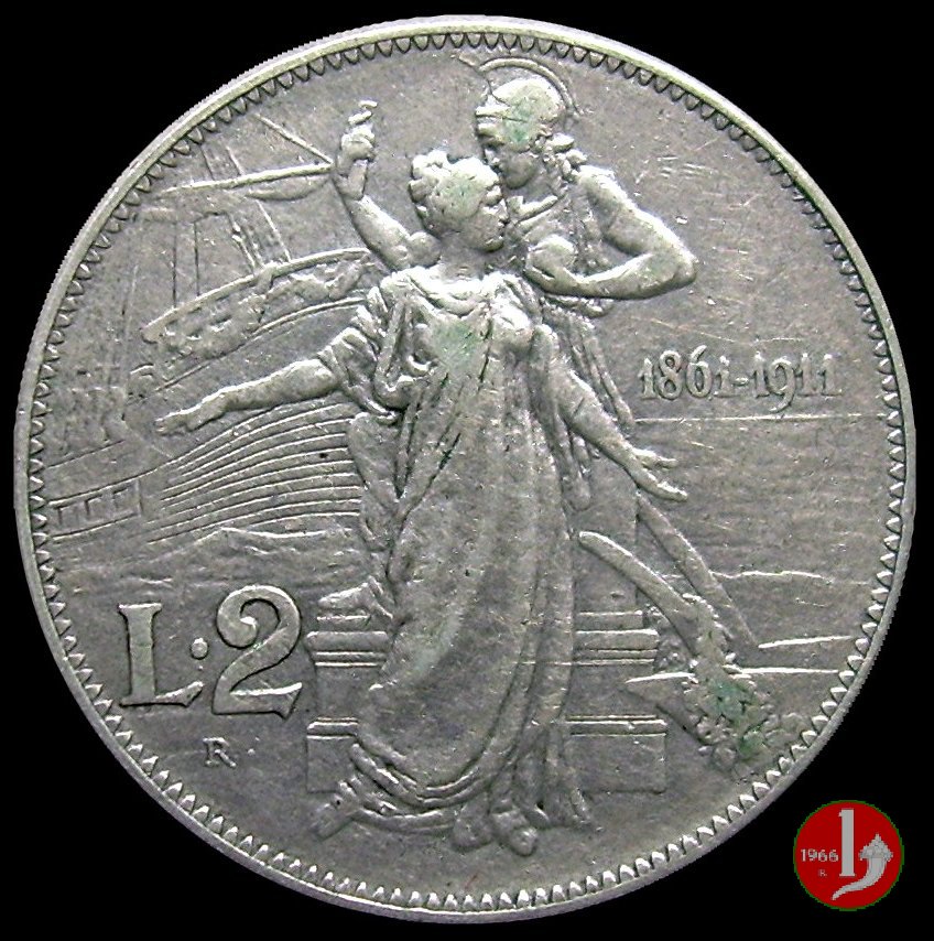 2 lire 50° Unità d'Italia Obverse: Testa del Re volta a sinistra, attorno: VITTORIO EMANUELE III RE D'ITALIA. Sotto il collo del Re i nomi dell'autore (D. TRENTECOSTE) e dell'incisore (L. GIORGI INC.). Reverse: Due figure allegoriche che simboleggiano l'Italia (la figura femminile) e la città di Roma (la figura maschile posta su di un piedistallo al cui lato si intravede un aratro). Sullo sfondo la prora di una nave mercantile. A destra le date 1861-1911. A sinistra l'indicazione del valore (L.2) e sotto il segno di zecca (R). | |