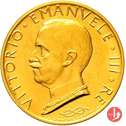 prova 100 lire littore Dritto: Testa nuda a destra. Intorno, circolarmente, VITTORIO • EMANUELE • III • RE • E • IMP •. In esergo il nome dell'autore (G. Romagnoli) Verso: Littore gradiente a sinistra, che reca il fascio nella destra e la Vittoria nella sinistra. Attorno ITA-LIA. In basso a sinistra l'indicazione dell'era fascista e a destra la data. In esergo lo scudo sabaudo tra il valore (LIRE 100). A destra il segno di zecca (R). Nel campo, in basso a sinistra la dicitura PROVA. | |
