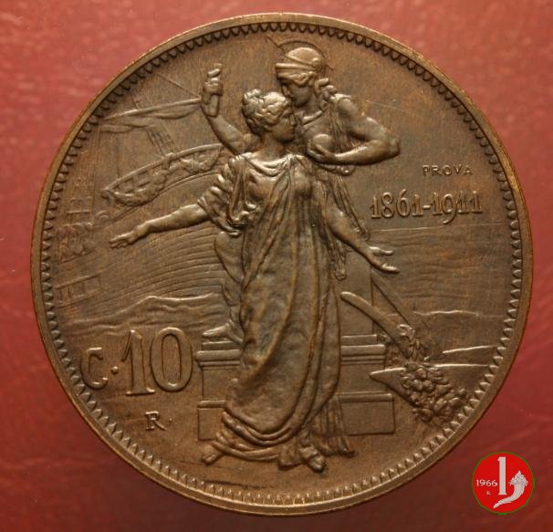 Verso: Allegoria di Roma e dell'Italia, poggiante la mano sinistra su aratro infiorato. Sullo sfondo, una nave mercantile festonata. A sinistra, su due righe l'indicazione del valore e il segno di zecca (C. 10/ R). A destra, le date del cinquantenario (1861-1911). Al di sopra delle date, orizzontalmente, la dicitura "PROVA".