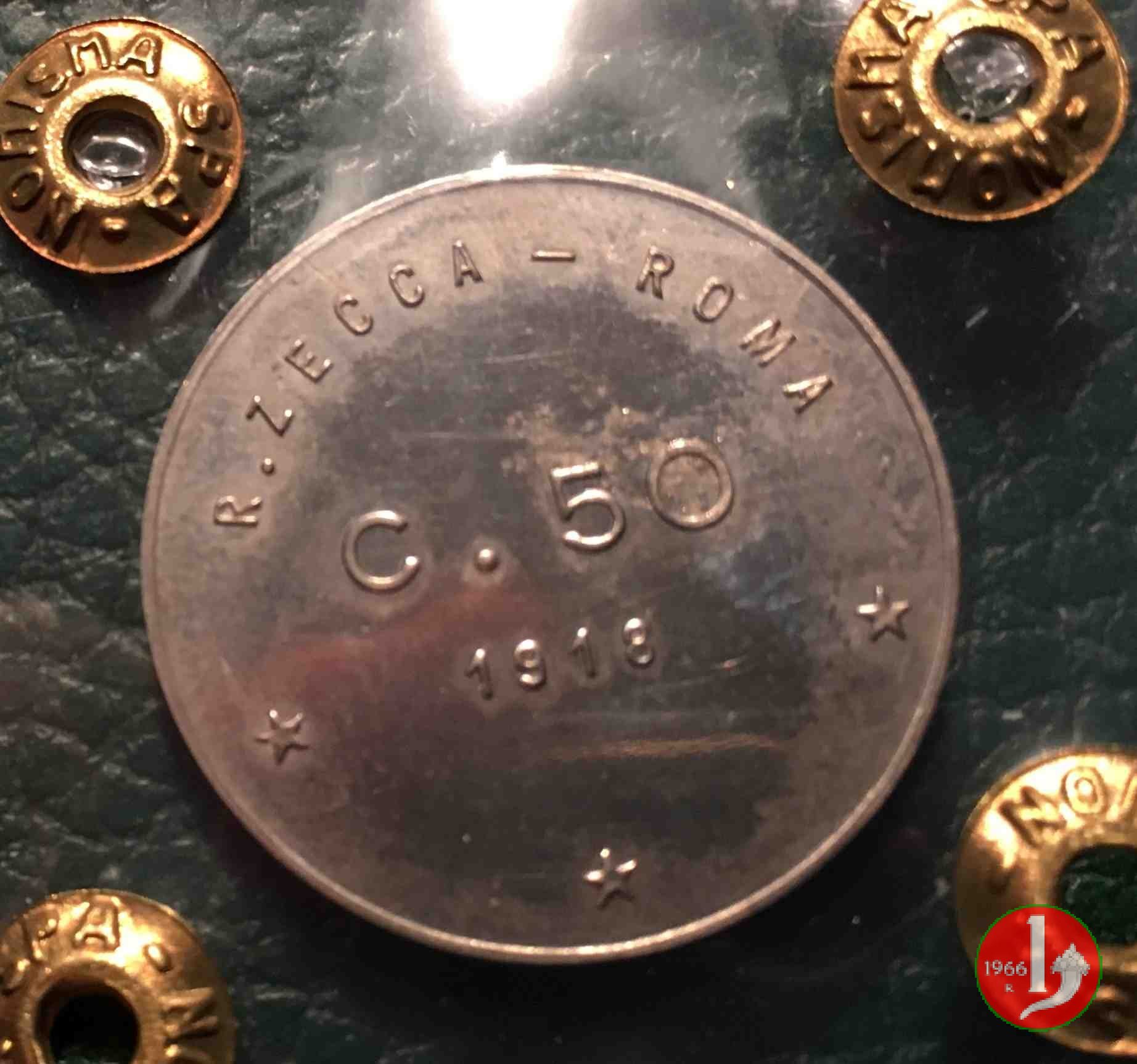 prova 50 centesimi 1918 Dritto: testa elmata a sinistra; attorno: stella REGNO D'ITALIA e a destra la data. Verso: nel campo, il valore su nodo d'amore con rami d'alloro, in basso circolarmente, a sinistra "PROVA" e a destra "SJ" | |