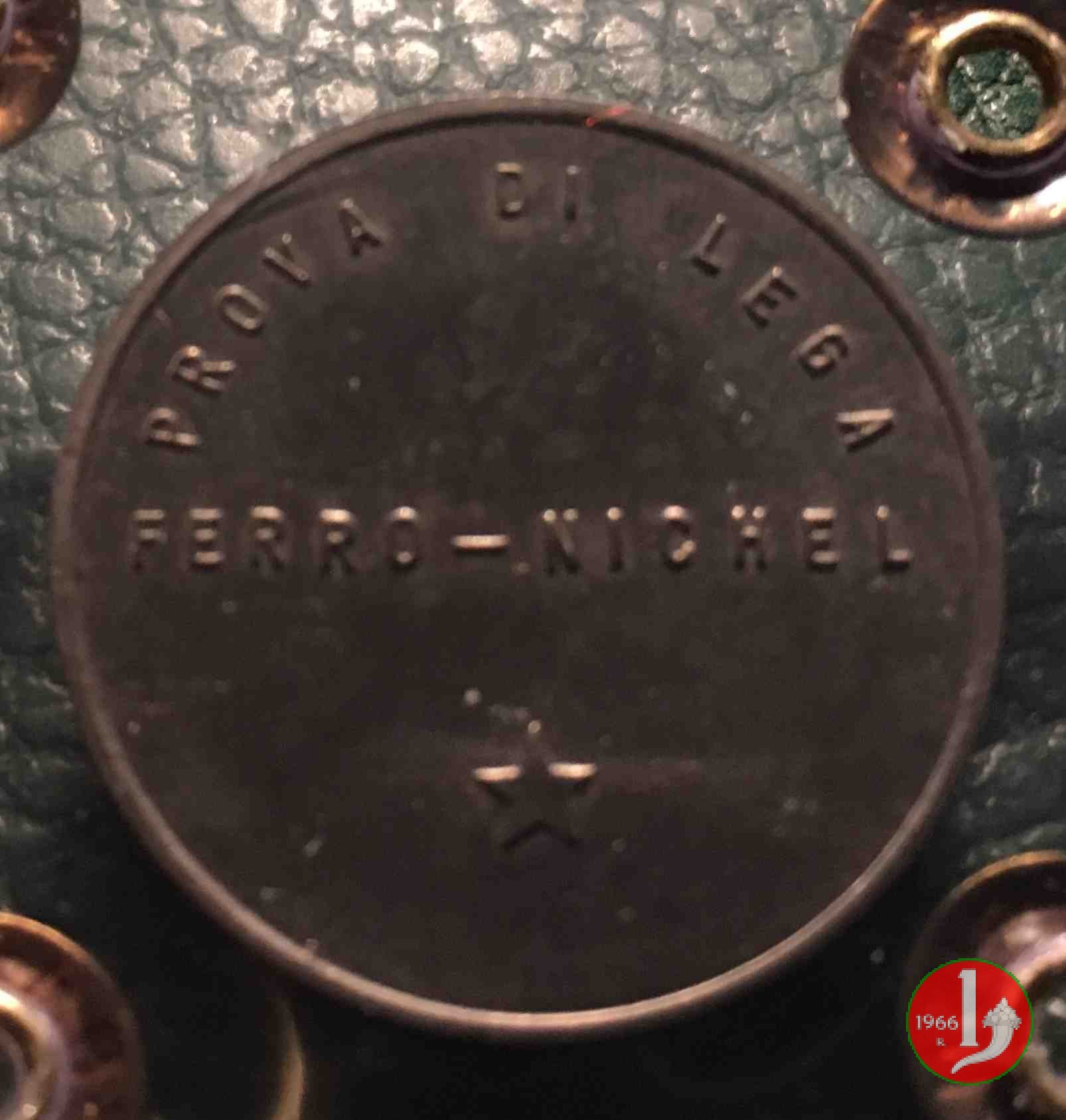 prova 50 centesimi in ferro e nichelio 1918 Dritto: Nel campo, su tre righe, l'indicazione del valore, la data e stella a cinque punte (C • 50/ ![]() 1918![]() / ![]() ). In alto, circolarmente "R.ZECCA ROMA".Verso: In alto, circolarmente "PROVA DI LEGA". Nel campo su due righe "FERRO NICHEL/ ![]() ". | |