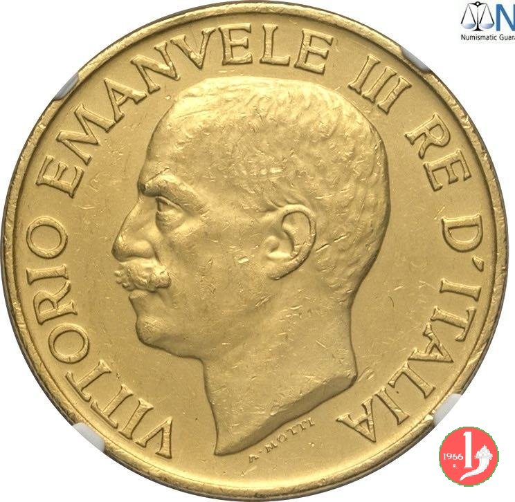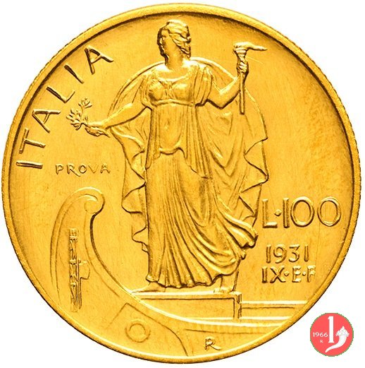 prova 100 lire prora Dritto: Semibusto in uniforme del Re con Collare dell'Annunziata, contornato dalla scritta VITTORIO •EMANUELE •III •RE. Sotto il busto, nodo Savoia, al di sotto del quale, lungo il bordo, i nomi dell'autore "G.Romagnoli" e dell'incisore "A.Motti inc." Verso: Allegoria dell'Italia, con fiaccola nella sinistra e ramo d'ulivo nella destra, su prua di nave, con fascio littorio in incuso. In alto, sul contorno, a sinistra ITALIA. A destra, su tre righe, il valore, la data e l'anno dell'era fascista. Nel campo a sinistra PROVA. | |
