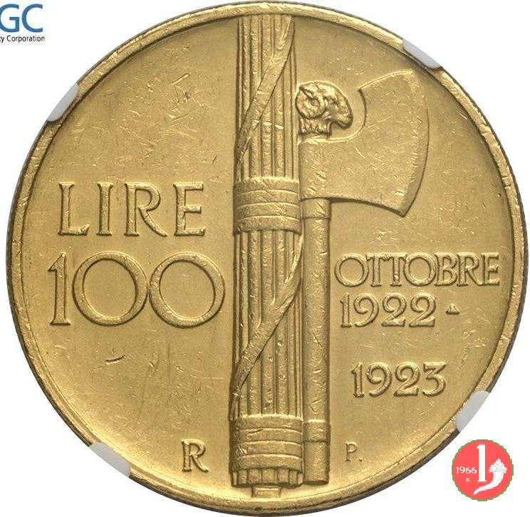 prova 100 lire fascio Dritto: Testa nuda del Re volta a sinistra. Indicazione dell'autore (A. MOTTI) sotto il collo del Re. Attorno VITTORIO EMANUELE III RE D'ITALIA Verso: Fascio littorio con la scure a destra. Nel campo a sinistra, su due righe LIRE 100, e il mdz in basso; a destra su tre righe OTTOBRE 1922 •1923, e in basso P • | |