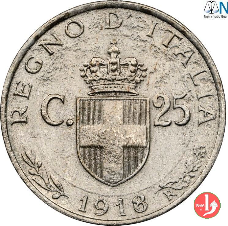 progetto 25 centesimi 1918 Dritto: testa con corona turrita a destra; circolarmente a destra, REGNO D'ITALIA e in basso, tra due stelle, la data. Verso: nel campo, "25", in alto, circolarmente, "CENTESIMI" e nel basso nodo Sabaudo tra due rami d'alloro, con ancora sotto, il segno di zecca e circolarmente a sinistra "PROVA S.J.". | |