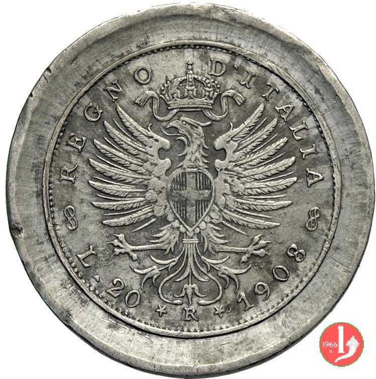 impronta in piombo 20 lire aquila sabauda Dritto: Testa nuda, volta a sinistra. Intorno, circolarmente "VITTORIO EMANVELE III". Al di sotto del collo il nome dell'incisore (SPERANZA). Verso: Aquila araldica ad ali spiegate, coronata e caricata in petto dello scudo sabaudo. In alto , circolarmente, fra due nodi sabaudi, " ![]() REGNO D'ITALIA![]() ". In basso il segno di zecca tra due stelle (![]() 1908![]() ), con a sinistra il valore (L. 20) e a destra la data (1908). | |