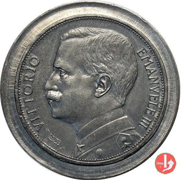 prova 50 centesimi leoni Dritto: Semibusto in uniforme, con testa nuda, volta a sinistra. Intorno, circolarmente "VITT • EM • III • RE • D'ITALIA" Verso: Allegoria dell'Italia, recante una fiaccola nella mano sinistra, su carro a destra, trainato da quattro leoni. In alto "AEQVITAS". Sul carro, a sinistra, la data e in esergo, l'indicazione del valore (C. 50). | |