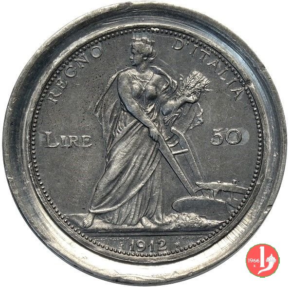 Impronta in piombo delle 50 lire aratrice Dritto: Semibusto in uniforme, a testa nuda, volto a sinistra. Intorno, circolarmente VITTORIO EMANVELE III e in basso a sinistra nodo sabaudo in rettangolo Verso: Allegoria dell'Italia agricola, recante nella sinistra un fascio di spighe, mentre con la destra regge un aratro. Ai lati il valore (LIRE / 50). In alto, circolarmente REGNO D'ITALIA. All'esergo, a sinistra l'indicazione dell'autore (BONINSEGNA) e a destra il nome dell'incisore (L. GIORGI INC.) In basso la data, tra il segno di zecca e stella a cinque punte (R 1912 ![]() ) | |