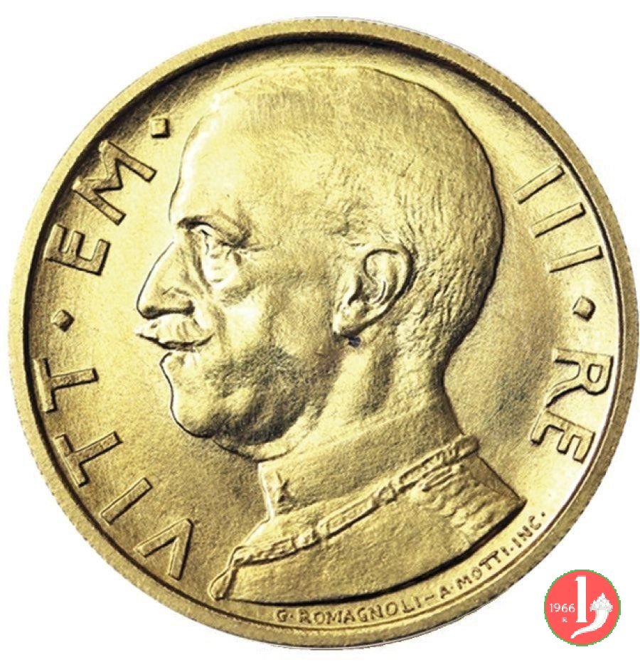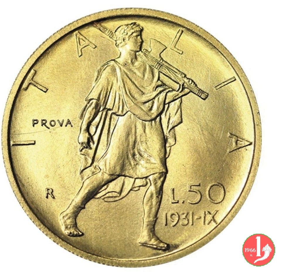 prova 50 lire littore Dritto: Busto del Re in uniforme, con il collare dell'Annunziata, volto a sinistra, attorno: VITT EM III RE • Sotto il collo del Re, lungo il bordo, i nomi dell'autore (G. ROMAGNOLI) e dell'incisore (A. MOTTI INC.). Verso: Littore, gradiente a destra, con fascio littorio sulla spalla sinistra. A destra, in basso, indicazione del valore (L. 50) sotto al quale vi è l'indicazione del millesimo e dell'anno dell'Era Fascista, in corrispondenza a sinistra segno di zecca (R). Nel campo, a sinistra, la dicitura "PROVA". | |