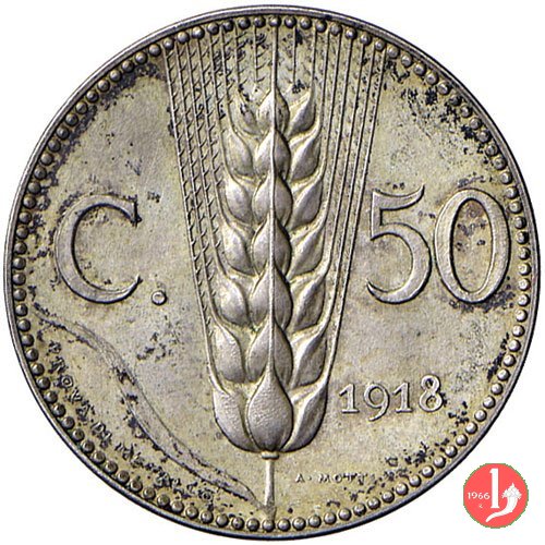prova 50 centesimi in mistura Dritto: Testa nuda volta a destra. Intorno, circolarmente, "VITTORIO EMANVELE III RE D'ITALIA". Verso: Spiga di grano. Ai lati il valore (C./50) e a destra la data (1918). Nel basso, circolarmente la dicitura "PROVA DI METALLO". | |