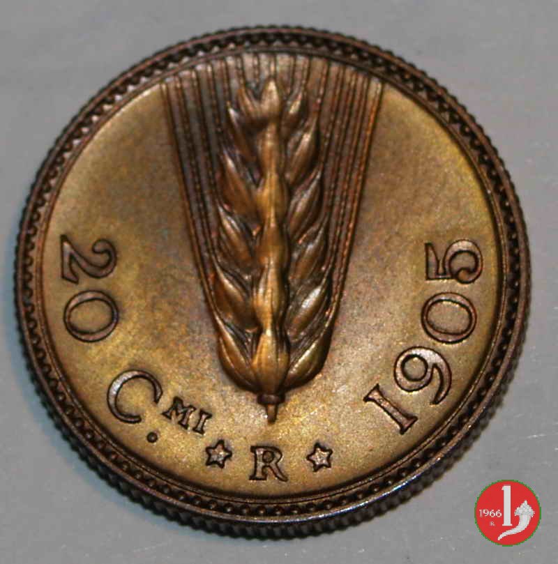 progetto 20 centesimi 1905 Dritto: nel campo, spiga di grano verticale; in basso, circolarmente, REGNO D'ITALIA e sotto la spiga, "S.J.". Verso: nel campo, spiga incussa, sotto, circolarmente, il valore, e tra due stelle "R" e la data. | |
