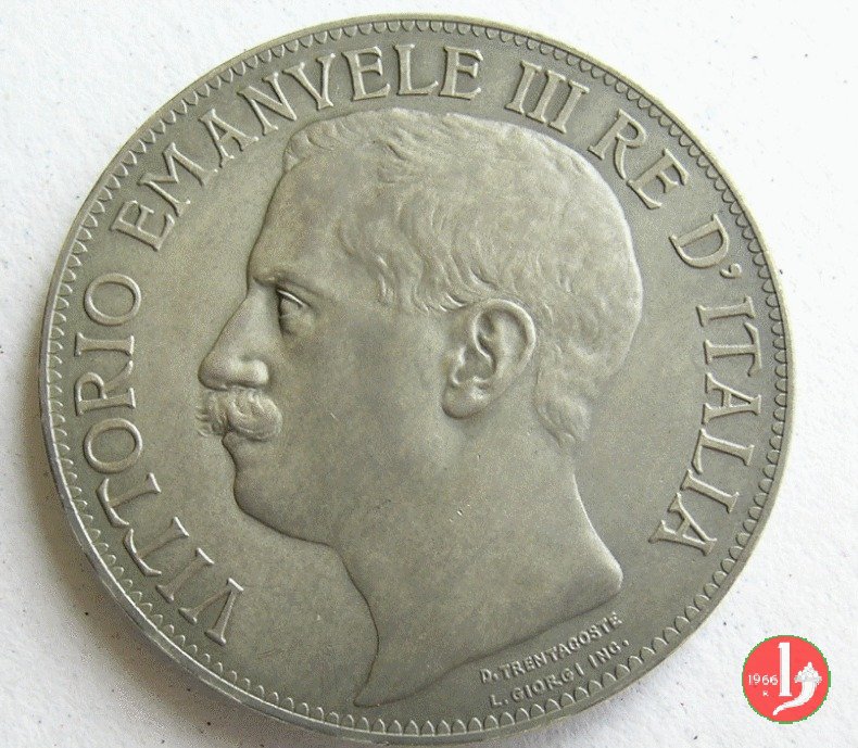 prova 50 lire 50° Unità d'Italia Dritto: Testa nuda a sinistra. Intorno VITTORIO EMANUELE III RE D'ITALIA. In basso in due righe il nome dell'autore (D •TRENTACOSTE) e dell'incisore (L •GIORGI INC •). Verso: Rappresentazione simbolica dell'Italia, in piedi presso il monumento della Gran Madre Roma; nello sfondo una nave da guerra ornata di festoni, e piú avanti, a sinistra, un aratro infiorato, al di sopra del quale sono incise le due date 1861-1911. L'indicazione del valore è a destra e sotto il marchio di zecca (R). Nel campo a destra, in alto, scritto orizzontalmrnte "PROVA". | |