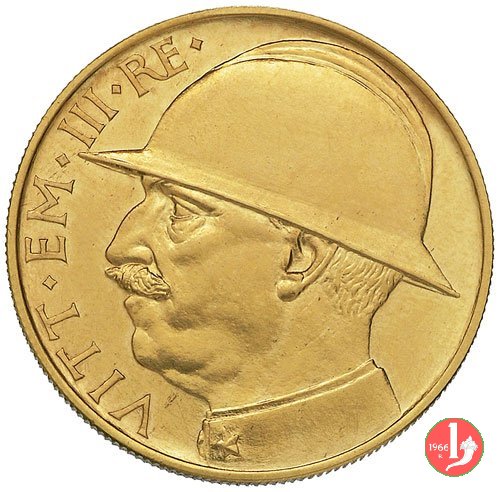 prova 20 lire cappellone Dritto: Semibusto a sinistra in uniforme e con l'elmetto. Sul contorno a sinistra VITT • EM • III • RE • Verso: Parte superiore del fascio littorio con scure a destra, sormontata da testa leonina. Sulla scure è il motto, su sette righe MEGLIO • / VIVERE • VN • / GIORNO • DA • / LEONE • CHE • / CENTO • ANNI • / DA • PECO RA •. In alto ITALIA, a destra della testa del leone la parola PROVA; a sinistra su tre righe lindicazione del valore (L. /20) e il marchio di zecca ( R ). Sulle legature del fascio in alto MCMXVIII e in basso, su due righe, MCMXXVIII / A VI. | |