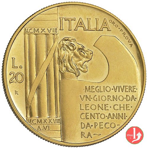 prova in oro 20 lire elmetto Dritto: Semibusto elmato e in uniforme a sinistra. A sinistra VITT • EM • III • RE • Verso: Fascio littorio, sormontato da testa di leone, con la scure a destra sul quale è in incuso, su sei righe E' • MEGLIO • VIVERE •/ UN • GIORNO • DA •/ LEONE • CHE •/ CENTO • ANNI •/ DA •PECO -/ RA -• In alto ITALIA; sul bordo a destra, circolarmente ORO PROVA. A sinistra del fascio su tre righe il valore (L./20) e il marchio di zecca (R). Nella legatura in alto MCMXVIII e in basso su due righe MCMXXVIII/ A VI. | |