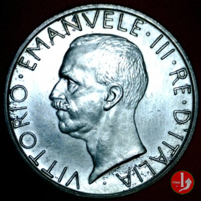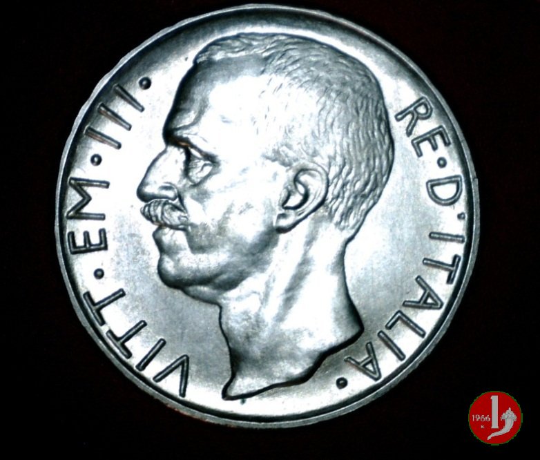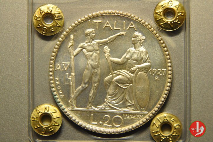 prova 20 lire littore Dritto: Testa nuda del Re volta a destra contornata dalla scritta VITTORIO EMANUELE III RE Verso: Littore con fascio che saluta romanamente una figura femminile (allegoria dell'Italia) seduta che reca una fiaccola con la mano destra e appoggia la sinistra ad uno scudo con lo stemma Sabaudo. In esergo l'indicazione del valore (L. 20) e a destra su due righe il nome dell'autore (G. ROMAGNOLI) e dell'incisore (A. MOTTI INC.). A destra della figura femminile su due righe l'anno e il segno di zecca (R); in corrispondenza a sinistra l'anno dell'Era Fascista. In alto la scritta ITALIA. Nel campo, a sinistra e in basso, circolarmente la dicitura "PROVA". | |