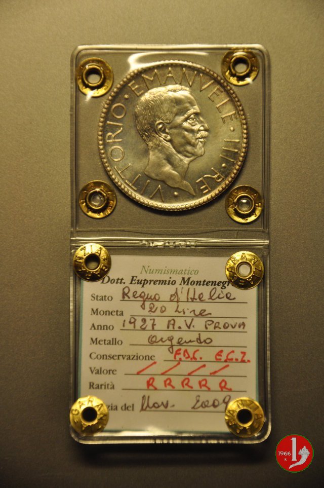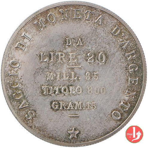saggio 20 lire 1927 Dritto: Busto in uniforme con testa nuda a sinistra, attorno: VITTORIO EMANUELE III, davanti al nodo sabaudo in rettangolo Verso: Nel campo in sette righe: DA LIRE 20 - MILL.35 TITOLO 800 GRAM.15 -; attorno: SAGGIO DI MONETA D'ARGENTO e in basso * | |