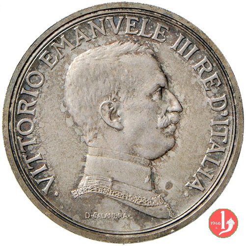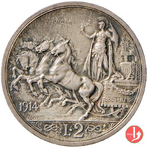 prova 2 lire quadriga briosa Dritto: Busto a testa nuda, volto a destra. Intorno, circolarmente VITTORIO EMANVELE III RE D'ITALIA. In basso, il nome dell'autore (D. CALANDRA). Verso: Allegoria dell'Italia, recante nella mano sinistra uno scudo e nella destra un ramoscello d'ulivo, su quadriga briosa verso sinistra, ornata da fiori e dal motto FERT, Sotto le zampe dei cavalli la data. Nell' esergo, il valore e due nodi sabaudi ( ![]() L • 2 ![]() ), tra il segno di zecca, a sinistra ( R ) e la stella d'Italia, a destra. Al di sopra della linea dell'esergo, a sinistra, il nome dell'autore (D. CALANDRA) e a destra il nome dell'incisore (A. MOTTI INC.) | |