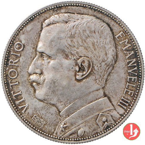 prova Scudo quadriga briosa Dritto: Busto a destra, in uniforme e con il collare dell'Annunziata. Intorno VITTORIO EMANUELE III RE D'ITALIA. Sotto, il nome dell'autore (D •CALANDRA). Verso: Allegoria dell'Italia, stante su quadriga briosa, ornata di fiori e della scritta FERT, che tiene lo scudo nella sinistra e un ramo di ulivo nella destra. Sotto i cavalli la data e in basso il nome dell'autore (D •CALANDRA). In basso a destra il nome dell'incisore (A •MOTTI INC •). In esergo il valore (L.5) tra nodi sabaudi, il marchio di zecca (R) a sinistra e la stella d'Italia a destra. Nel campo in alto a sinistra, circolarmente, 1a PROVA. | |