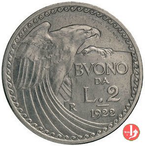 prova tecnica 2 lire Dritto: Busto con testa nuda, volto a destra. Intorno, circolarmente "VITTORIO EMANVELE III RE D'ITALIA". Tra le parole della legenda fregi e foglie. In basso a sinistra "M". Verso: Aquila volta a destra con targa entro la quale è il valore su tre righe (BVONO/DA/L.2), in basso a sinistra il marchio di zecca (R) e la data (1922). In alto a destra, circolarmente, "PROVA TECNICA". | |