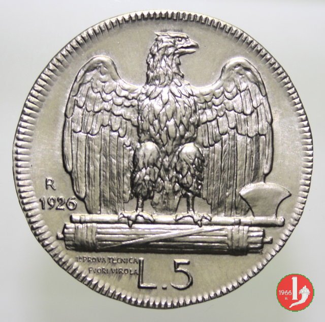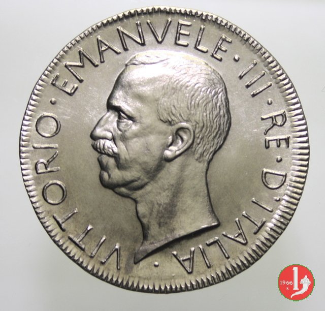 prova tecnica 5 lire Dritto: Testa nuda, volta a sinistra. Intorno, circolarmente, VITTORIO • EMANVELE • III • RE • D'ITALIA • Verso: Aquila spiegata, su fascio orizzontale, con scure a destra. A sinistra, su due righe, il segno di zecca (R) e la data. In esergo l'indicazione del valore. Su due righe, orizzontalmente, "1A PROVA TECNICA FUORI VIROLA". | |