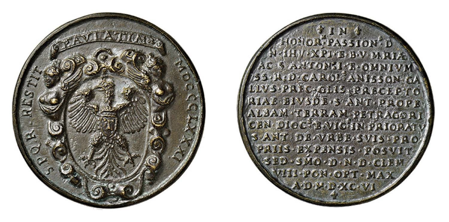 Verso: nel campo: giglio IN giglio = HONOR • PASSION • D = N • IHV • XPT • ET • B • V • MARIAE = AC • S • ANTONII • ET • OMNIVM = SS • R • D • CAROL •